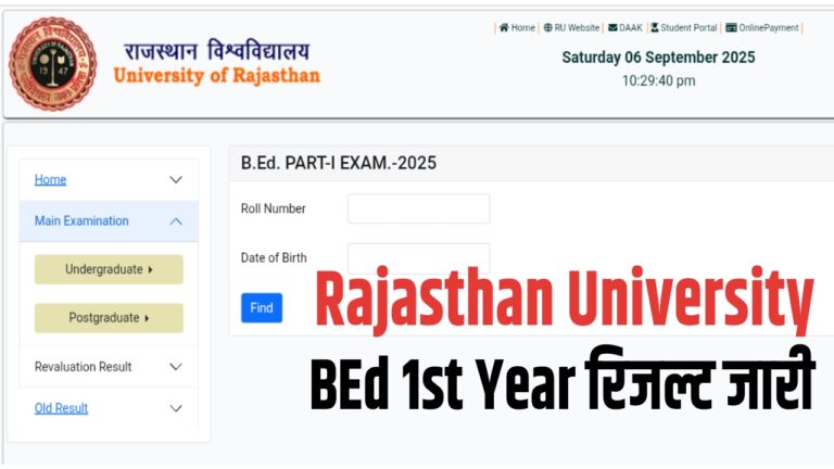 राजस्थान यूनिवर्सिटी (University of Rajasthan, Jaipur) ने आखिरकार बी.एड. (B.Ed) फर्स्ट ईयर का रिजल्ट 2025 जारी कर दिया है। लंबे …