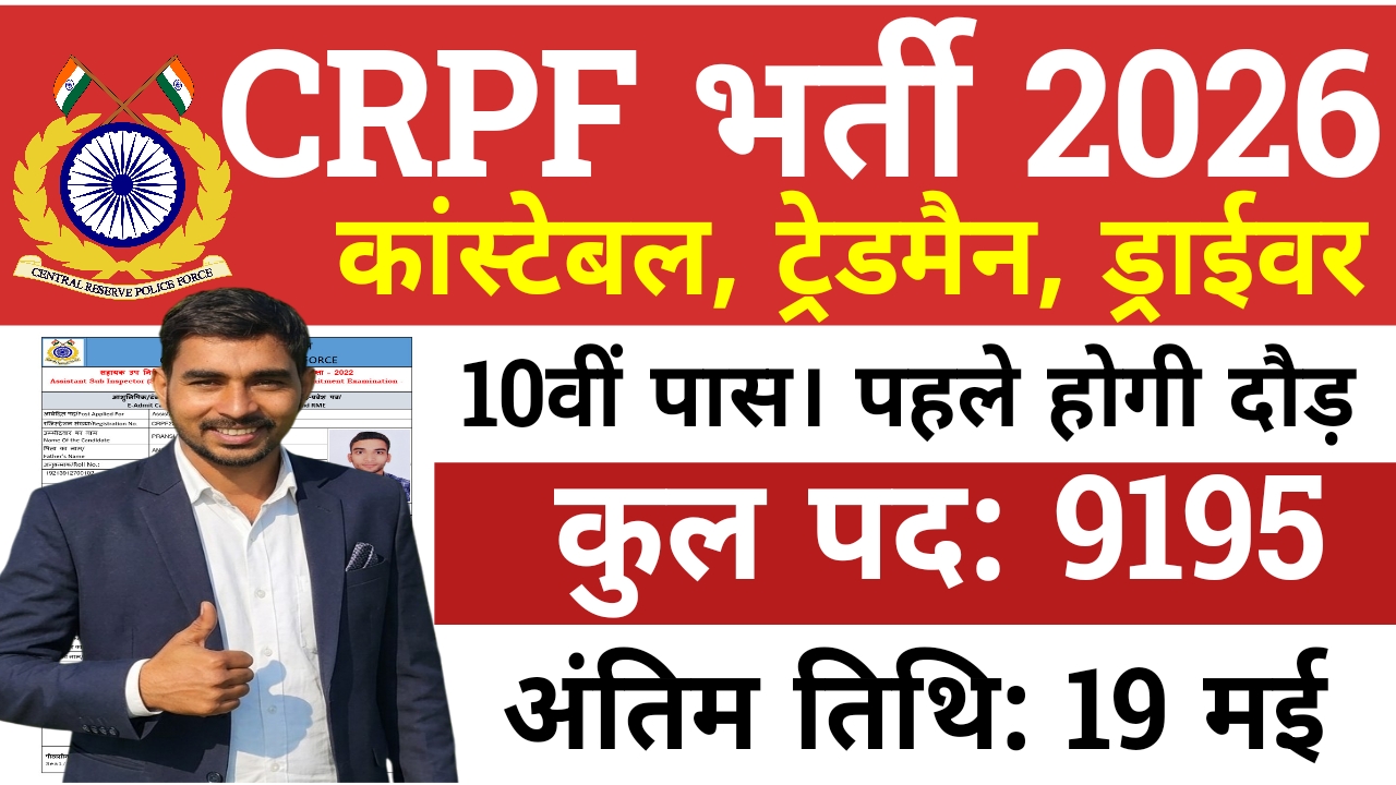अगर आप सरकारी नौकरी की तैयारी कर रहे हैं और Central Reserve Police Force (CRPF) में शामिल होने का सपना देख रहे हैं, तो आपके लिए शानदार मौका सामने आया है। CRPF New Recruitment 2026 के तहत कुल 9195 पदों पर भर्ती का नोटिफिकेशन जारी किया गया है। इस भर्ती में Constable, Tradesman, Driver और Technical जैसे पद शामिल हैं। खास बात यह है कि इस भर्ती में पुरुष और महिला दोनों उम्मीदवार आवेदन कर सकते हैं