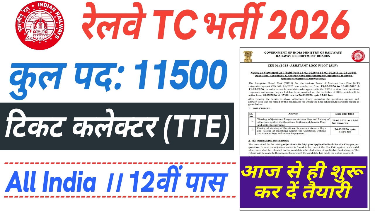 अगर आप 2026 में सरकारी नौकरी की तैयारी कर रहे हैं तो आपके लिए रेलवे में शानदार मौका आ चुका है। Railway Recruitment Board (RRB) द्वारा TTE (Travelling Ticket Examiner) के पदों पर बड़ी भर्ती की तैयारी की जा रही है। इस भर्ती के तहत लगभग 11500 पदों पर आवेदन मांगे जाएंगे। पुरुष और महिला दोनों उम्मीदवार इस भर्ती के लिए आवेदन कर सकते हैं।